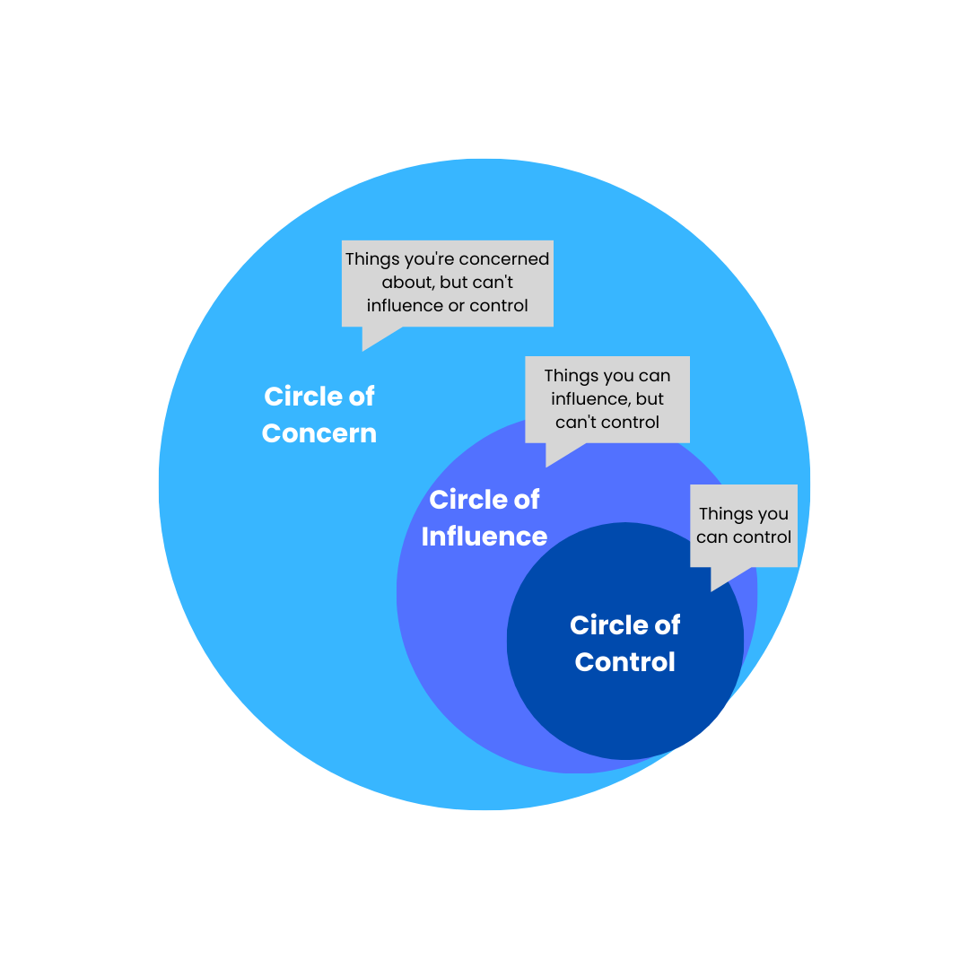 We focus on what we can control, in this we then take an active role in shaping our life and creating the outcomes we would like. If we spend too much time focusing on the circle of concern, trying to control things outside of our control, this can be intensely frustrating. We must acknowledge these limitations and stop worrying about things outside of our circle of control.
